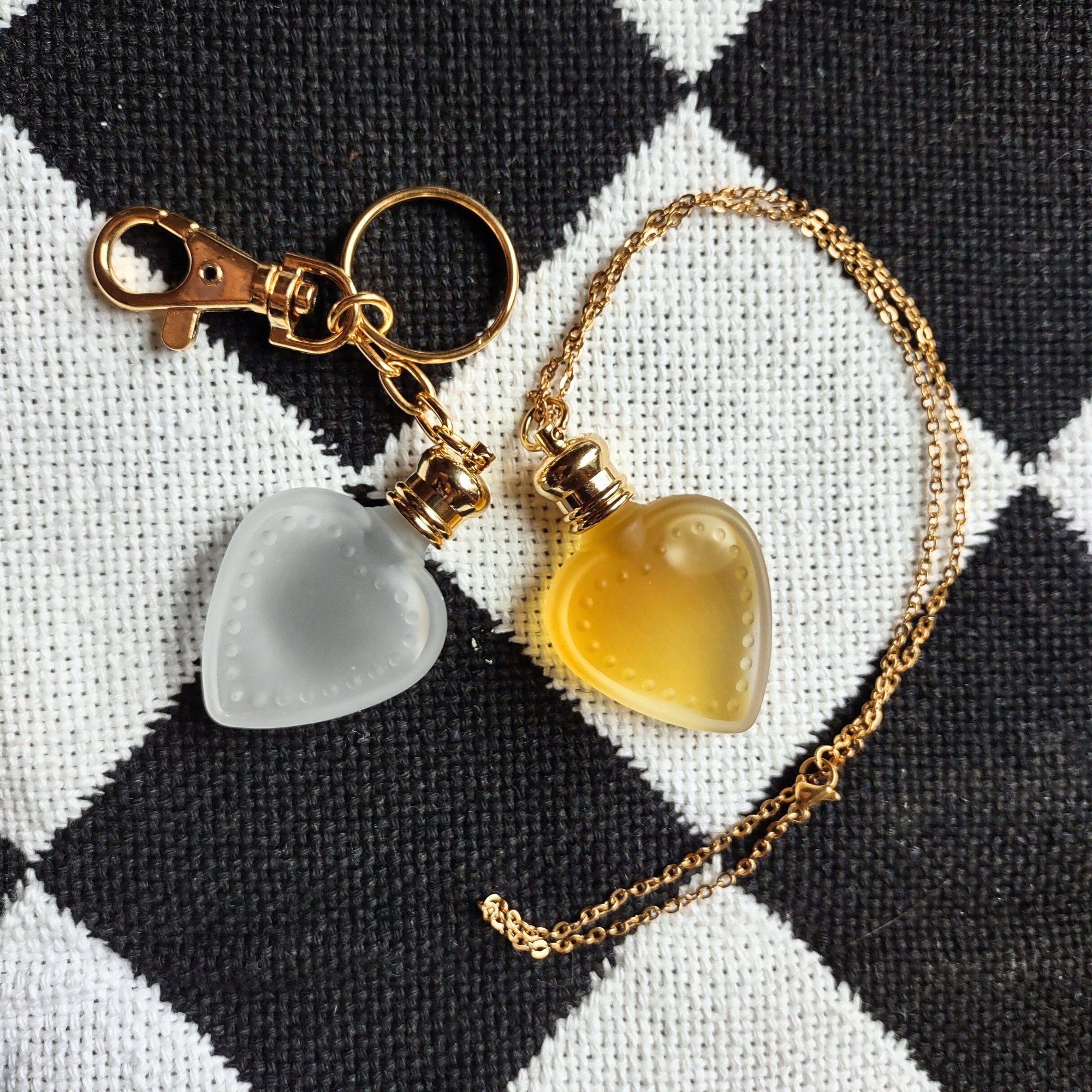 4ml frosted glass heart-shaped perfume bottle on a gold-filled chain. The chain is either 18 or 24 inches, or available as a keychain. Honestly my newest favorite necklace. Any fragrance in the catalog is available for these necklaces!