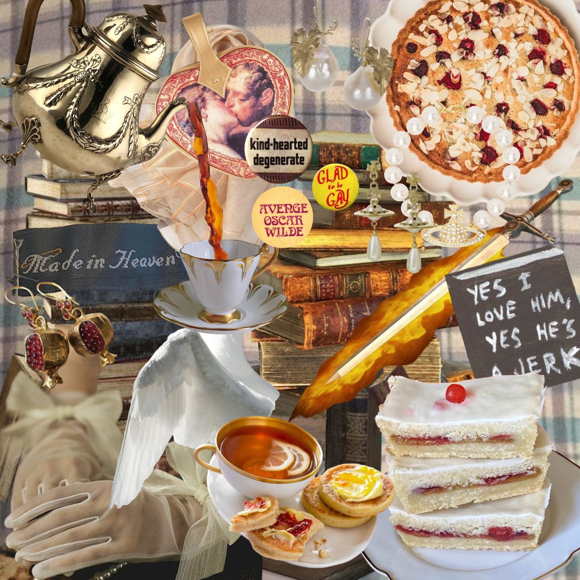Rich buttered crumpets, spice tea, fresh Italian espresso, hot croissants, and a half-eaten Bakewell Tart.